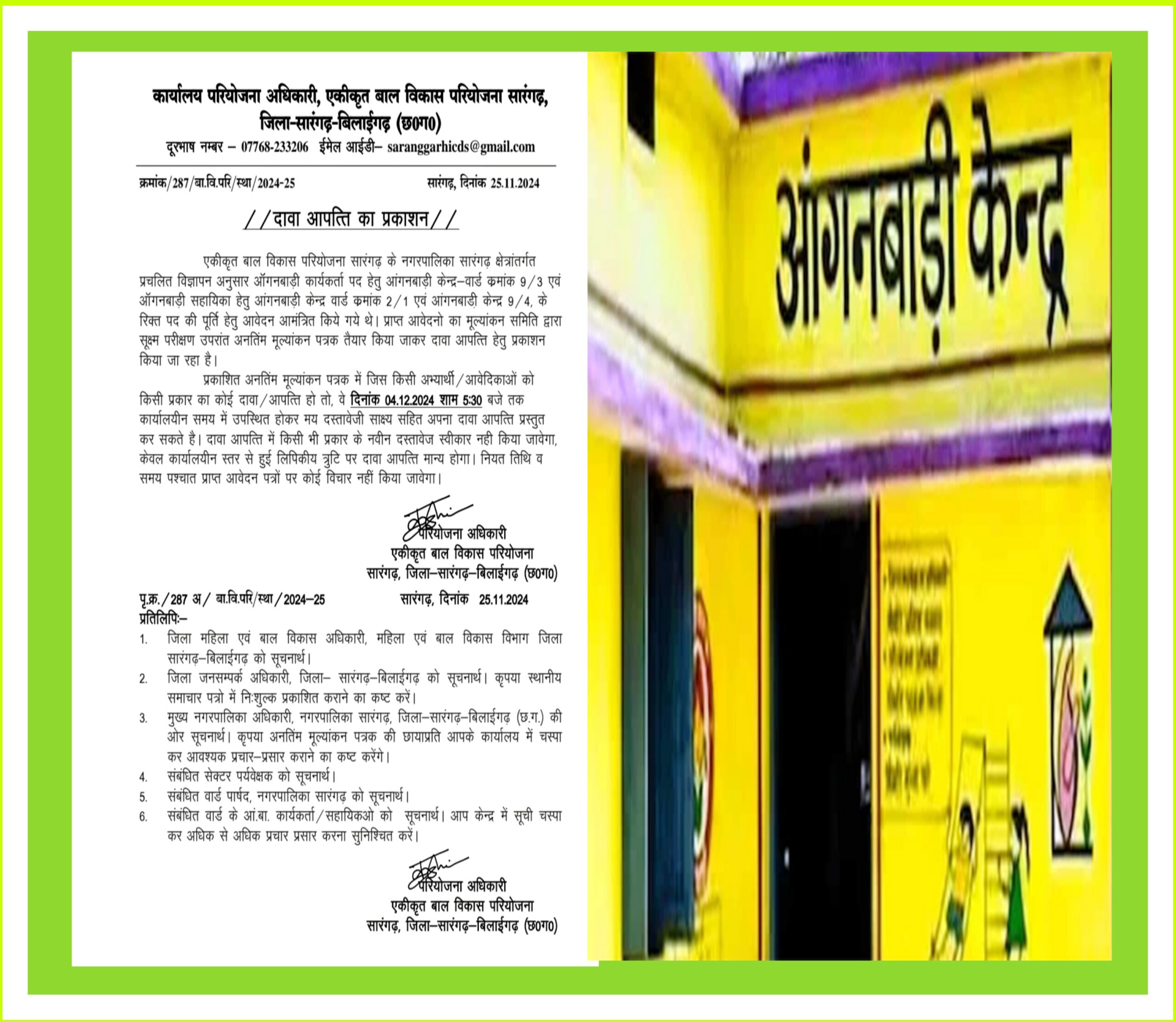 इसी प्रकार सारंगढ़ नगरपालिका क्षेत्र अंतर्गत आंगनबाड़ी कार्यकर्ता पद हेतु आंगनबाड़ी केंद्र वार्ड 9/3 एवं आंगनबाड़ी सहायिका हेतु आंगनबाड़ी केंद्र वार्ड 2/1 एवं आंगनबाड़ी केंद्र 9/4 के रिक्त पद हेतु आवेदन आमंत्रित किए गए थे। प्रकाशित अंन्नतिंम मूल्यांकन पत्रक में जिस किसी महिला अभ्यर्थी या आवेदिकाओं को किसी प्रकार का कोई दावा, आपत्ति हो तो वे 4 दिसंबर 2024 को शाम 5:30 बजे तक कार्यालयीन समय में उपस्थित होकर मय दस्तावेजी साक्ष्य सहित अपना दावा आपत्ति प्रस्तुत कर सकते है। इन दोनों नगरपालिका और ग्रामीण क्षेत्र के आंगनबाड़ी केंद्र के लिए की जा रही भर्ती के दावा आपत्ति में किसी भी प्रकार के नवीन दस्तावेज स्वीकार नहीं किया जाएगा। केवल कार्यालयीन स्तर से हुई लिपिकीय त्रुटि पर दावा आपत्ति मान्य होगा। नियत तिथि व समय पश्चात प्राप्त आवेदन पत्रों पर कोई विचार नहीं किया जाएगा।