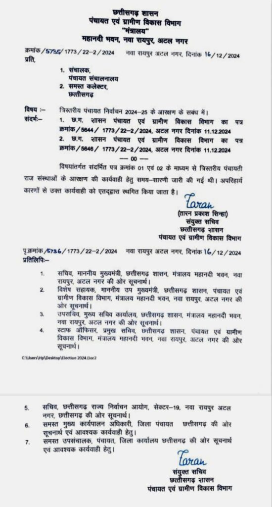 सारंगढ़ बिलाईगढ़, 16 दिसंबर 2024/पंचायत एवं ग्रामीण विकास विभाग मंत्रालय नवा रायपुर से 16 दिसंबर 2024 को आरक्षण की कार्यवाही स्थगित करने के लिए संचालक पंचायत संचालनालय एवं राज्य के सभी कलेक्टर को इस संबंध में पत्र जारी किया है। पूर्व में त्रिस्तरीय पंचायत आम निर्वाचन 2024-25 के लिए सारंगढ़ बिलाईगढ़ जिले में प्रवर्गवार एवं महिलाओं के आरक्षण हेतु 17 दिसंबर 2024 को कलेक्टर कार्यालय व ब्लॉक कार्यालयों के सभाकक्ष में कार्यवाही तय किया गया था जिसमें जिला पंचायत के सदस्य, तीनों जनपद पंचायत के अध्यक्ष व सदस्य एवं तीनों ब्लॉक सारंगढ़ बिलाईगढ़ और बरमकेला के ग्राम पंचायत के सरपंच व पंच के पद शामिल थे।
