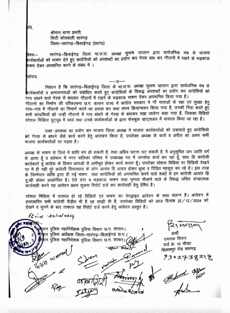 भाजपा जिलाध्यक्ष के भाषण से जिले में शांति भंग हो सकती है, तथा अप्रिय घटना घट सकती है, मै अनुसूचित जन जाति वर्ग से आता हूँ व वर्तमान में नगर पालिका परिषद में उपाध्यक्ष पद में जनसेवा कार्य कर रहा हूँ,साथ ही कांग्रेसी कार्यकर्ता हूं कांग्रेस के विचार धाराओं से अभीभूत होकर कार्य करता हूँ। उपरोक्त सोशल मिडिया पर विडियों देखने पर मैं ही नही पुरे कांग्रेसी विचारधारा के लोग अत्यंत हि आहत होकर क्षुब्द व पीड़ित महसूस कर रहे है। इस तरह के जिम्मेदार व्यक्ति द्वारा दी गई भाषण व कांग्रेसियों को अपमानित करने वाले शब्दों से हम कांग्रेसी अत्यंत हि दुःखी होकर आक्रोसित है। ऐसे दंगा व भड़काऊ भाषण तथा घृणता फैलाने वाले के विरूद्ध उचित दंण्डात्मक कार्यवाही करने यह आवेदन प्रथम सूचना रिपोर्ट दर्ज कर कार्यवाही हेतु प्रेषित है ।सोशल मिडिया में वायरल हो रहे विडियों एवं भाषण का पेनड्राइव आवेदन के साथ संलग्न है। आवेदन में हस्ताक्षरित सभी कांग्रेसी पीडीत भी है वह साझी भी है, उपरोक्त विडियों को आज दिनांक 22/12/2024 को देखने व सुनने के बाद तत्काल यह रिपोर्ट दर्ज करने हेतु आवेदन प्रस्तुत है।