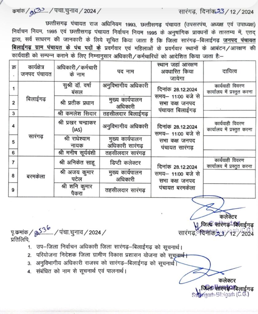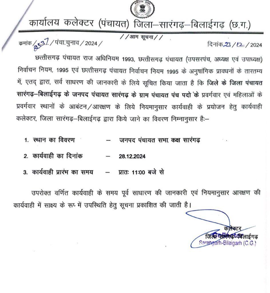 सारंगढ़ बिलाईगढ़,//त्रिस्तरीय पंचायत आम निर्वाचन 2024-25 के लिए सारंगढ़ बिलाईगढ़ जिले में प्रवर्गवार एवं महिलाओं के आरक्षण हेतु 28 और 29 दिसंबर 2024 को कलेक्टर कार्यालय व ब्लॉक कार्यालयों के सभाकक्ष में कार्यवाही निर्धारित है, जिसमें जिला पंचायत के सदस्य, तीनों जनपद पंचायत के अध्यक्ष व सदस्य एवं तीनों ब्लॉक सारंगढ़, बिलाईगढ़ और बरमकेला के ग्राम पंचायत के सरपंच व पंच के पद शामिल हैं। इस आशय की आम सूचना और आदेश कलेक्टर कार्यालय सारंगढ़ बिलाईगढ़ से जारी किया गया है।