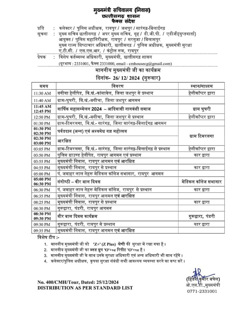 सारंगढ़ बिलाईगढ़, //मुख्यमंत्री विष्णु देव साय 26 दिसंबर को दोपहर में जिले के मां नाथलदाई की भूमि पर ग्राम पंचायत टिमरलगा में आयोजित पर्वत दान (अन्न) एवं अश्वमेध यज्ञ महोत्सव में शामिल होंगे।मुख्यमंत्री बनने के बाद विष्णु देव साय जी पहली बार सारंगढ़ बिलाईगढ़ जिले में आगमन हो रहे है