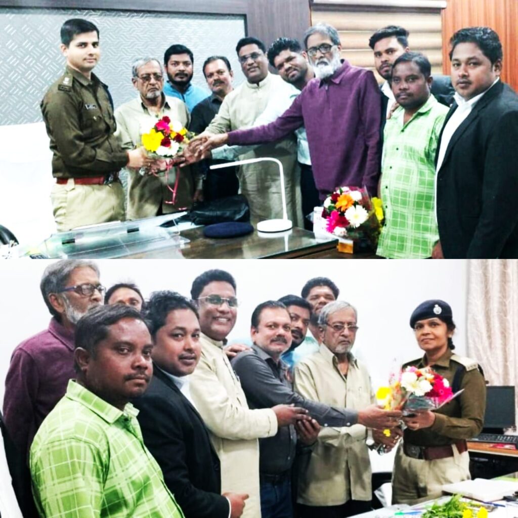 सारंगढ़ बिलाईगढ़ // जिला श्रमजीवी पत्रकार संघ के पत्रकारों ने जिले के पुलिस कप्तान पुष्कर शर्मा एवं अतिरिक्त पुलिस अधीक्षक श्रीमती निमिषा पांडे से सौजन्य भेंट कर गुलदस्ता देकर नव वर्ष की शुभकामनाएं दी। संघ के प्रदेश उपाध्यक्ष अब्बास अली सैफी, जिला अध्यक्ष गोल्डी नायक, ब्लॉक अध्यक्ष गोपेश द्विवेदी के साथ संघ के पदाधिकारी ने जिला पुलिस प्रशासन को शहर की यातायात व्यवस्था, जिला बनने के बाद शहर के मुख्य मार्गो चौक चौराहो और बाजारों में बढ़ती भीड़ को देखते हुए सुव्यवस्थित आवागमन व्यवस्था व पासपोर्ट निर्माण में हो रही विलंबता को लेकर जिले के अधिकारियों का ध्यान आकृष्ट करते हुए ज्ञापन सौंपा।