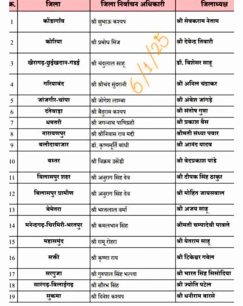 CHHATTISGARH, raipur, SARANGARH BILAIGARH भारतीय जनता पार्टी ने 19 जिला अध्यक्षों की सूची किया जारी देखें लिस्ट Milan das MahantJanuary 7, 2025January 7, 2025 खबर को शेयर करें रायपुर – भारतीय जनता पार्टी ने 19 जिलाध्यक्ष की सूची जारी की है और उन पर विश्वास जताया है। जिले के चुनाव प्रभारी के द्वारा जिले में बंद लिफाफे को कार्यकर्ताओं के सामने खोला गया। Milan das Mahant