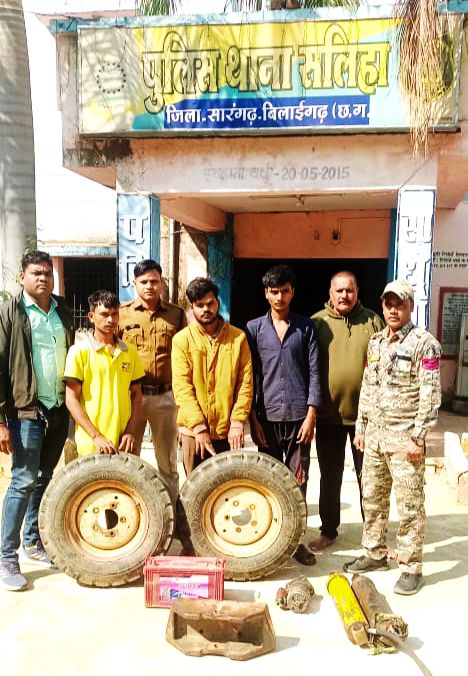सारंगढ़ बिलाईगढ़ // पुलिस अधीक्षक महोदय श्री पुष्कर शर्मा के द्वारा अवैध कार्यों में सन्निपट व्यक्तियों के विरुद्ध सख्त कानूनी कार्यवाही करने के निर्देश पर अतिरिक्त पुलिस अधीक्षक महोदया निमिषा पांडे एवं एसडीओपी बिलाईगढ़ श्री विजय ठाकुर महोदय की मार्गदर्शन में रूपेन्द्र नारायण साय के नेतृत्व मे दिनांक 7 /1 /2025 की रात्रि में चोरी किया चोरी गए ट्रैक्टर टायर एवं पार्ट्स को अज्ञात चोरों द्वारा चोरी कर ले गए थे पतासाजी कर दिनांक 10/ 1/ 2025 को आरोपी दामोदर पटेल यशवंत सिदार राजू यादव के कब्जे से दोनों आगे का ट्रैक्टर चक्का दो नग हाइड्रोलिक ट्रॉली जैक एक नग बैटरी एक नग सेल्फ एक नग बंफर को आरोपियों द्वारा छुपाए गए स्थान से आरोपियों के निसानदेही पर बरामद किया गया आरोपियों का कृत्य धारा 303 BNS का पाए जाने से गिरफ्तार कर न्यायिक रिमांड पर जेल भेजा गया