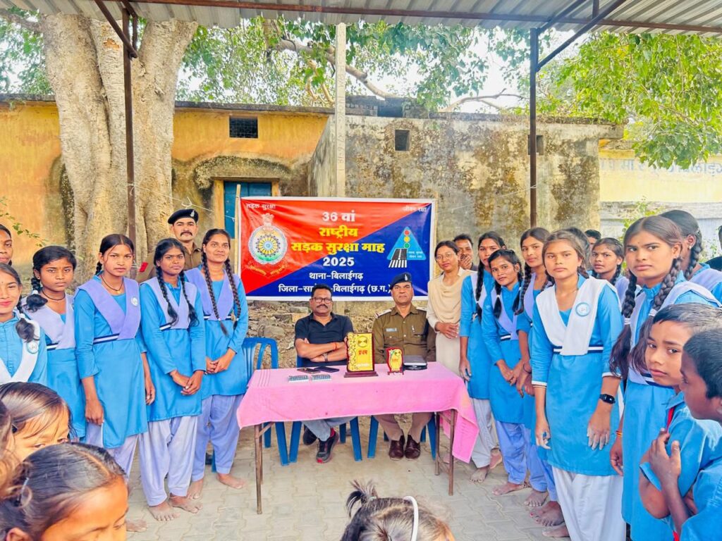 सारंगढ़ बिलाईगढ़ //पुलिस अधीक्षक पुष्कर शर्मा के द्वारा राष्ट्रीय सड़क सुरक्षा माह 2025 के अंतर्गत यातायात नियमों के संबंध में जानकारी एवं जागरूकता अभियान चलाने सभी थाना/ चौकी प्रभारी को निर्देशित किया गया है। इसी कड़ी में अतिरिक्त पुलिस अधीक्षक निमिषा पांडे तथा एसडीओपी श्री विजय ठाकुर के मार्गदर्शन में थाना प्रभारी प्रमोद यादव के नेतृत्व में आज दिनांक15/01/2025 को थाना बिलाईगढ़ पुलिस के द्वारा शासकीय कन्या उच्चतर माध्यमिक शाला बिलाईगढ़ में सड़क सुरक्षा जागरूकता अभियान चलाया गया ।