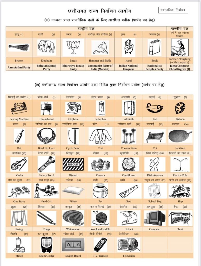 नगरपालिक निगम में महापौर, नगरपालिका और नगर पंचायत में अध्यक्ष पद हेतु प्रतीक चिन्ह: इसके अंतर्गत स्लेट, कांच का गिलास, ट्यूब लाईट, स्टूल, रोड रोलर, सीटी, प्रेशर कुकर, गले की टाई, बेन्च, अंगूठी, गैस सिलेण्डर, हारमोनियम, डीजल पम्प, चक्की, मेज, सेव, केतली, फ्राक, बाल्टी, द्वार घंटी, कुआ, ऑटो-रिक्शा, फलों से युक्त टोकरी, एअरकंडीस्नर, केक, चिमनी, हीरा, बांसुरी, अंगूर, माइक, मटर, सोफा, भाला फेंक, ट्रक, टायर, छडी, बटुआ, खिडकी, ईंट, बेल्ट, केल्कूलेटर, कारपेट, शतरंज बोर्ड, लैपटॉप, कैरम बोर्ड, आईसक्रीम, पेट्रोल पम्प, रेफ्रीजरेटर, रूम हीटर, सीसीटीवी कैमरा का मुक्त प्रतीक चिन्ह शामिल है।