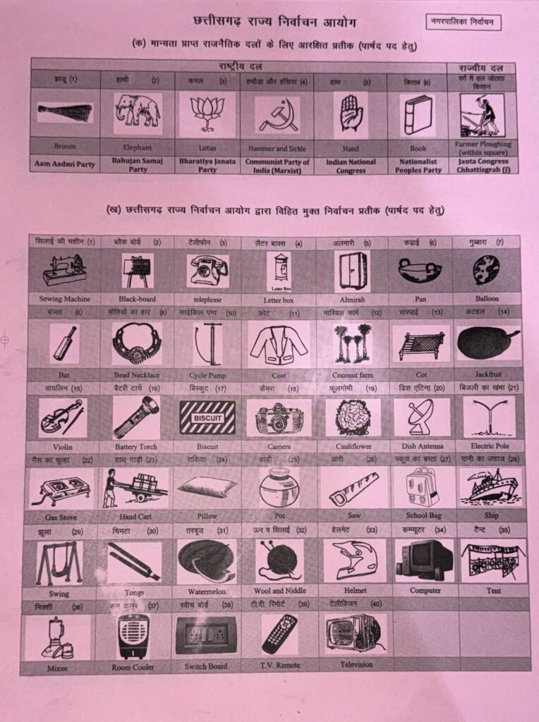 सारंगढ़ बिलाईगढ़,// / नगरपालिका आम निर्वाचन 2025 के लिए छत्तीसगढ़ राज्य निर्वाचन आयोग ने राज्य के सभी कलेक्टर को सभी नगरीय निकायों में पार्षद सहित नगरपालिक निगम में महापौर, नगरपालिका और नगर पंचायत में अध्यक्ष पद हेतु नाम निर्देशन पत्र में प्रतीक चिन्ह के उपयोग के लिए पत्र जारी किया है। इसके अनुसार मान्यता प्राप्त राष्ट्रीय, राज्यीय और अमान्यता प्राप्त रजिस्ट्रीकृत राजनैतिक दल के लिए आरक्षित प्रतीक चिन्ह से अलग प्रतीक चिन्ह की सूची जारी किया है।