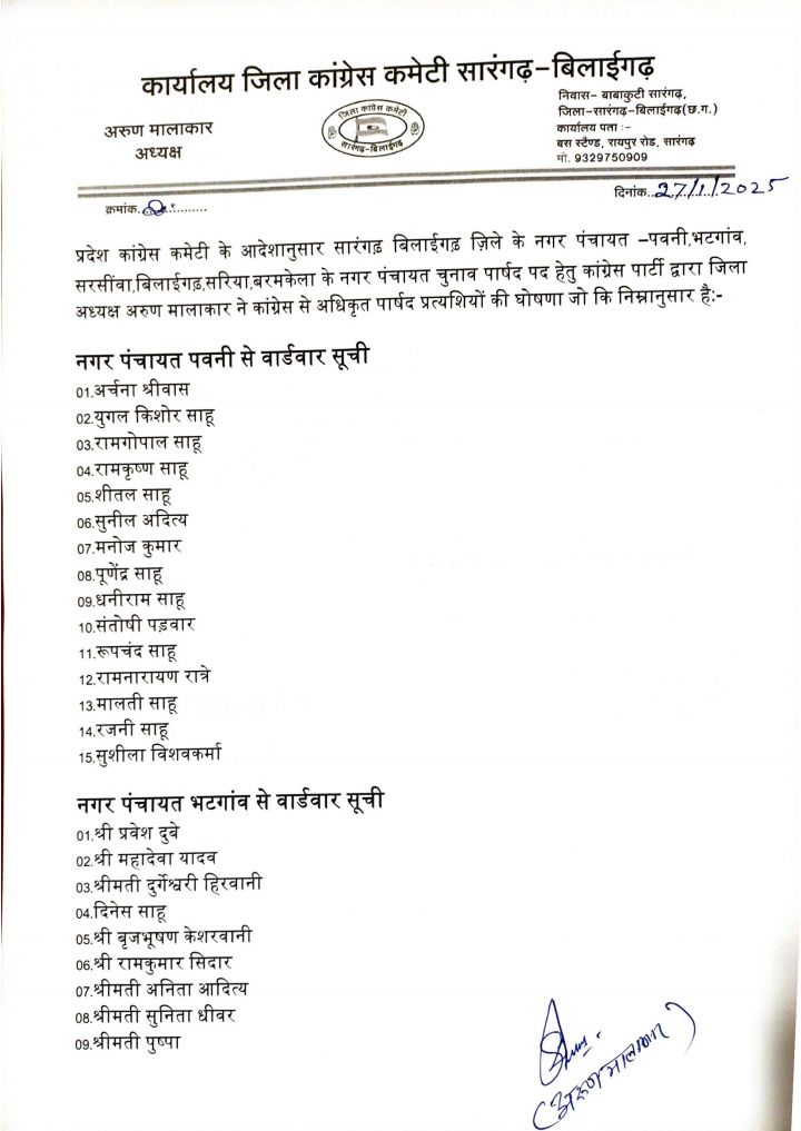 प्रदेश कांग्रेस कमेटी के आदेशानुसार सारंगढ़ बिलाईगढ़ ज़िले के नगर पंचायत -पवनी,भटगांव, सरसींवा,बिलाईगढ़,सरिया,बरमकेला के नगर पंचायत चुनाव पार्षद पद हेतु कांग्रेस पार्टी द्वारा जिला अध्यक्ष अरुण मालाकार ने कांग्रेस से अधिकृत पार्षद प्रत्यशियों की घोषणा जो कि निम्नानुसार है:-