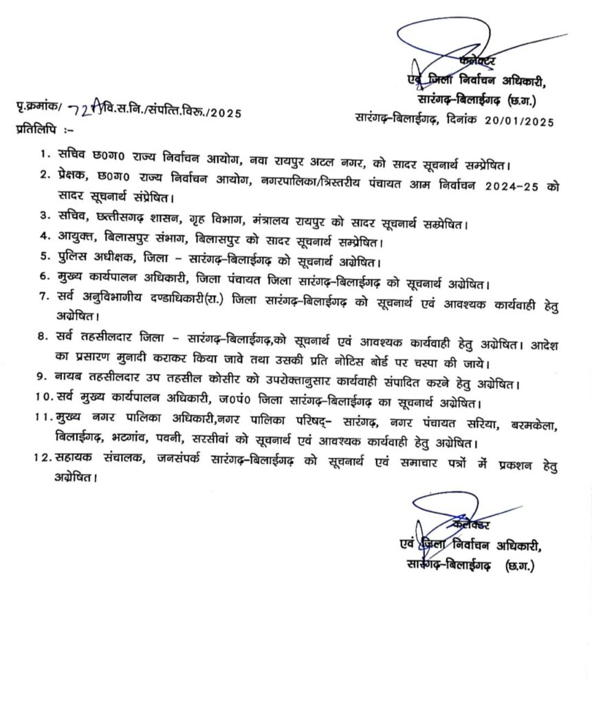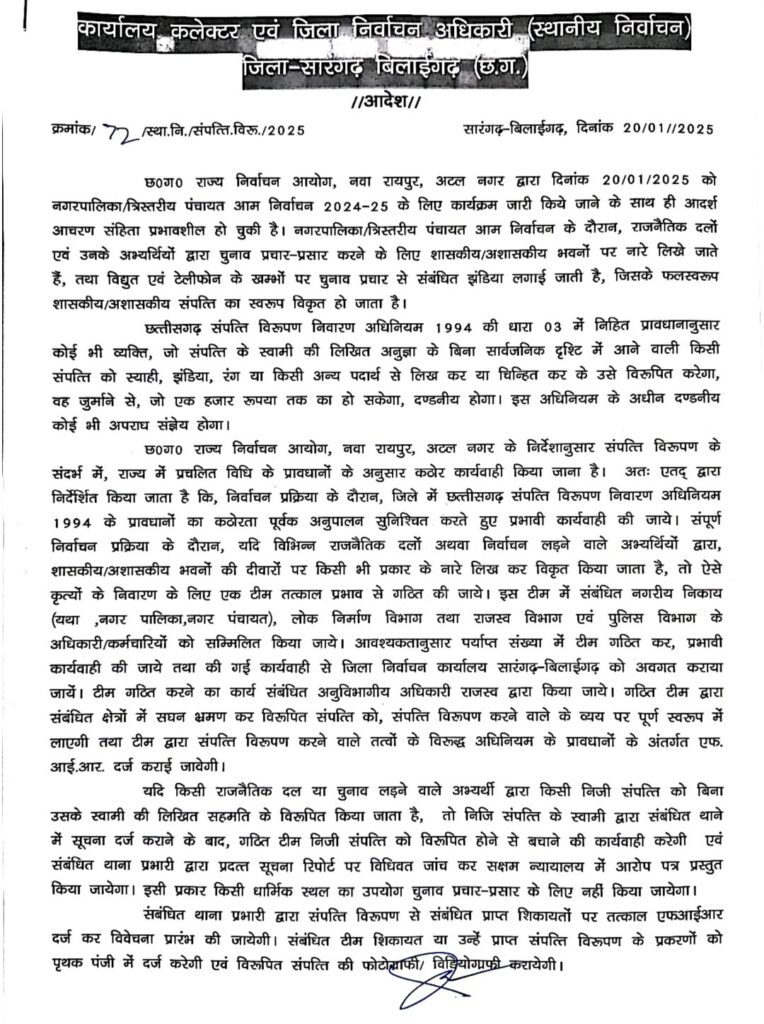 सारंगढ़ बिलाईगढ़,// 5 फरवरी 2025/कलेक्टर धर्मेश कुमार ने आदेश जारी कर कहा है कि छत्तीसगढ़ सम्पत्ति विरूपण निवारण अधिनियम 1994 के प्रावधानों का कठोरतापूर्वक अनुपालन सुनिश्चित करते हुए प्रभावी कार्यवाही की जाये।कोई भी शासकीय कर्मी, किसी भी मकान और दुकान मालिक को संपत्ति विरूपण में सहमति है तो लिखित सहमति पत्र प्राप्त करेंगे। यदि किसी व्यक्ति द्वारा सहमति के लिए दबाव बनाया जाता है तो यह निर्वाचन नियमों का उल्लंघन है और उस व्यक्ति के विरुद्ध कार्यवाही किया जाएगा।