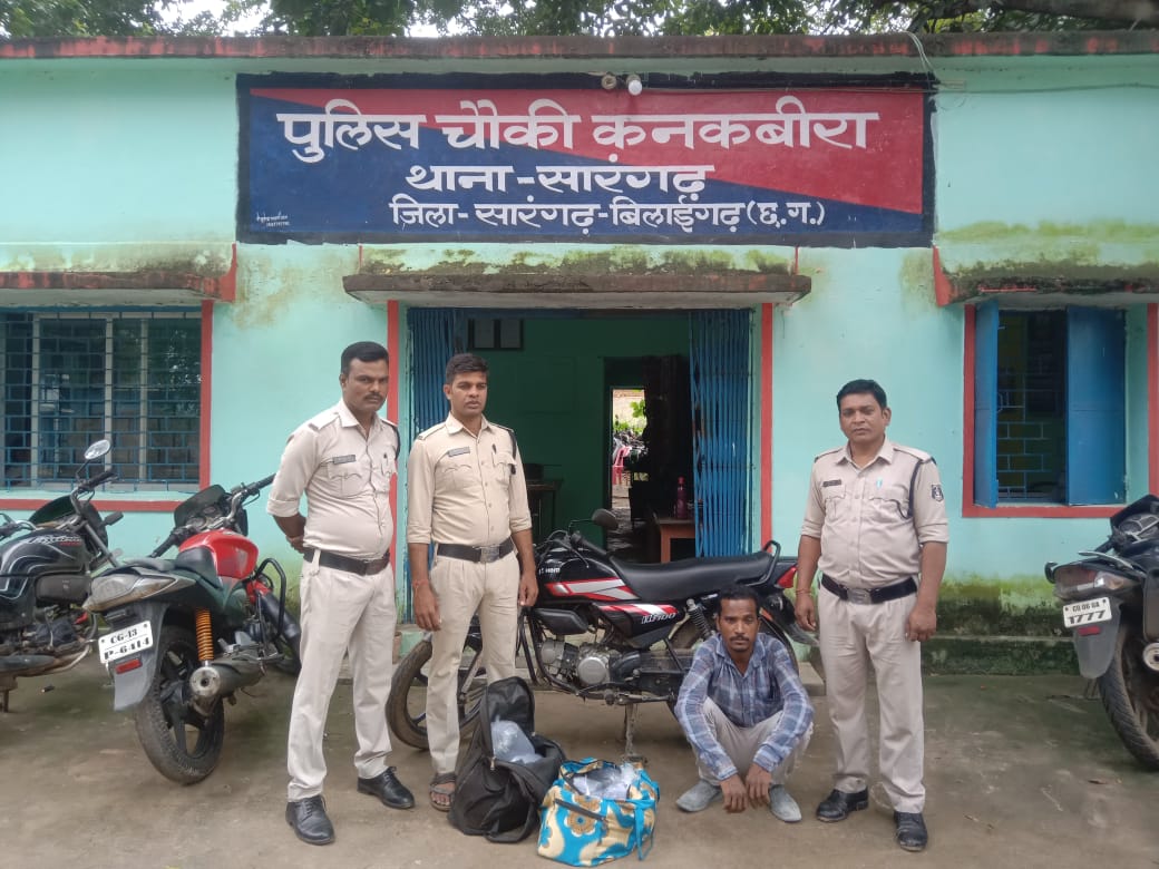पुलिस अधीक्षक महोदय सारंगढ बिलाईगढ छ०ग० श्री पुष्कर शर्मा के द्वारा जिले में अवैध नशे के करोबार को अंकुश लगाने हेतु लगातार कार्यवाही करने के निर्देशो पर चौकी कनकबीरा पुलिस द्वारा एसडीओपी स्नेहिल साहू के मार्गदर्शन पर आज दिनांक 14.09.2024 को जरिये मुखबीर सूचना पर ग्राम पीपरदा रोड पुलिया के उपर आरोपी कपिलनाथ कलेथ पिता मोहन लाल कलेथ निवासी काली थाना सिंघोडा जिला महासमुंद छ०ग को घेरा बंदी कर उसके कब्जे से 1. काला रंग के बैग में भरा 5, पालीथीन पैकेट में 5-5 लीटर कुल 25 लीटर कच्ची महुआ शराब किमती 5000 रूप्ये 2. एक छीटदार फुल छाप बैग के अंदर 4 पालीथीन पैकेट में 5-5 लीटर कुल 20 लीटर कच्ची महुआ शराब जुमला 45 लीटर कच्ची महुआ शराब किमती 9000 रूप्ये 3. एक मोटर सायकल हीरो एचएफ 100 काला. सफेद लाल पट्टीदार रंग का वाहन क्रमांक सीजी 06 एचए 1830 जिसका इंजन नं HA11EBP9D04902 चेचिस नं0 MBLHAC048P9056290 भारी मात्रा में अवैध कच्ची महुआ शराब बिकी हेतु मोटर सायकल से परिवहन करते पाये जाने से गवाहो के समक्ष जप्ती एवं दिनांक 14.09.2024 के 07.40 बजे गिरफ्तारी कर विधिवत आबकारी एक्ट के तहत आरोपी को न्यायायीक रिमाण्ड पर भेजा गया है।