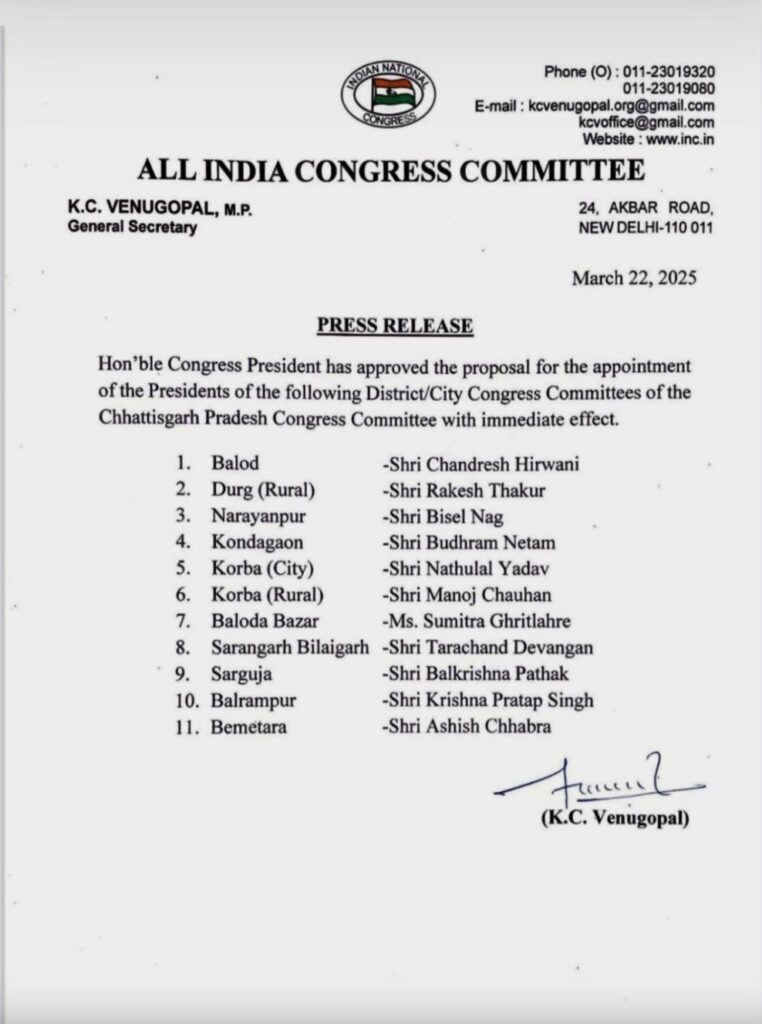 सारंगढ़ बिलाईगढ़//छत्तीसगढ़ प्रदेश कांग्रेस कमेटी ने सूचना जारी करते हुए छत्तीसगढ़ प्रदेश कांग्रेस कमेटी के कई जिलों के जिला अध्यक्ष बदले गए जिसमें सारंगढ़ बिलाईगढ़ में अरुण मालाकार को भी बदला गया और ताराचंद देवांगन जिला कांग्रेस कमेटी के अध्यक्ष बनाए गए देखे सूची