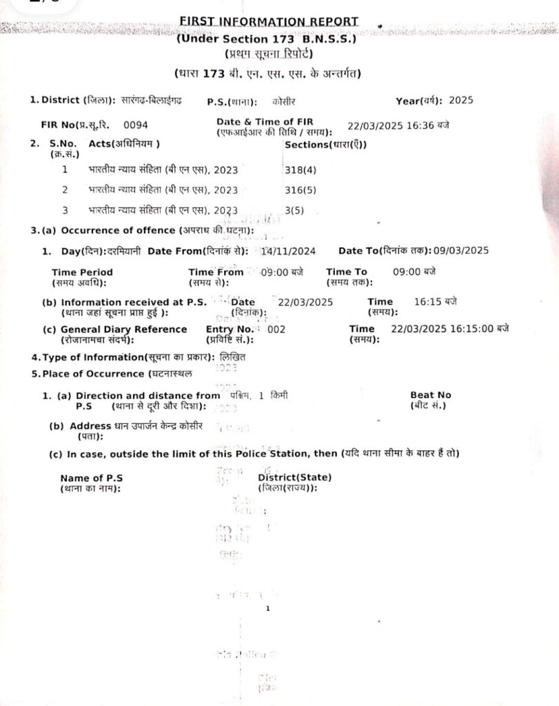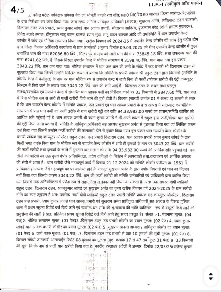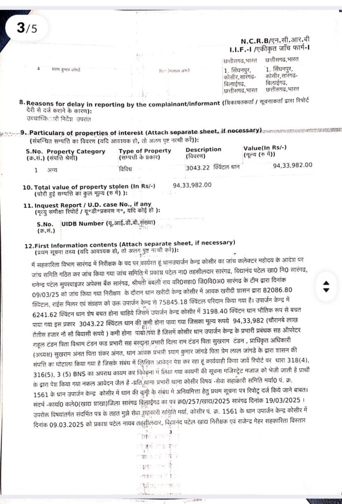 धान खरीदी केन्द्र कोसीर में जांच के दौरान 3043.22 क्विंटल धान की कमी, जिसका मूल्य रूपये 94,33,982 (चौरानबे लाख तैतीस हजार नौ सौ ब्यासी रूपये) कमी होना पाया गया है जिसमें कोसीर धान उपार्जन केन्द्र के प्रभारी प्रबंधक सह ऑपरेटर राहूल टंडन पिता विश्राम टंडन फड प्रभारी सह बरदाना प्रभारी दिला राम टंडन पिता सुखराम टंडन, प्राधिकृत अधिकारी (अध्यक्ष) सुखराम अंनत पिता शंकर अंनत, धान आवक प्रभारी श्याम कुमार जांगडे पिता प्रेम लाल जांगडे के द्वारा शासन की संपत्ति की चोरी का भारतीय न्याय संहिता की धारा 318(4), 316(5), 3(5) का कोसीर थाना में अपराध पंजीबद्ध किया गया है और इस धन राशि को भू-राजस्व की भांति व्यक्तिगत रूप से वसूली किये जाने की अनुशंसा किया गया।