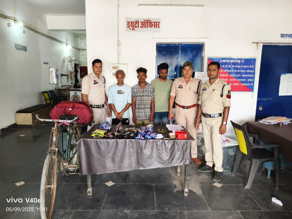 सारंगढ़ बिलाईगढ़ //श्रीमान पुलिस अधीक्षक महोदय श्री आंजनेय वार्ष्णेय, अति0 पुलिस अधीक्षक श्रीमती निमिषा पाण्डेय एवं एसडीओपी श्रीमति स्नेहिल साहू के द्वारा चोरी की घटनाओं पर रोकथाम हेतु लगातार निर्देशित किये जाने पर थाना प्रभारी कोतवाली कामिल हक के कुशल मार्ग दर्शन में थाना सिटी कोतवाली सारंगढ़ के पुलिस स्टाफ के द्वारा थाना क्षेत्रअंतर्गत विभिन्न स्थानों मे चोरी किये गए आरोपियों क़ो पकड़ने मे सफलता प्राप्त हुई कि (1.)दिनांक 12.04.2025 क़ो साराडीह निवासी हेमसागर सादावर्ती के दुकान से नगदी रकम व राजश्री, पान बाहर, सिगरेट व अन्य वस्तु,