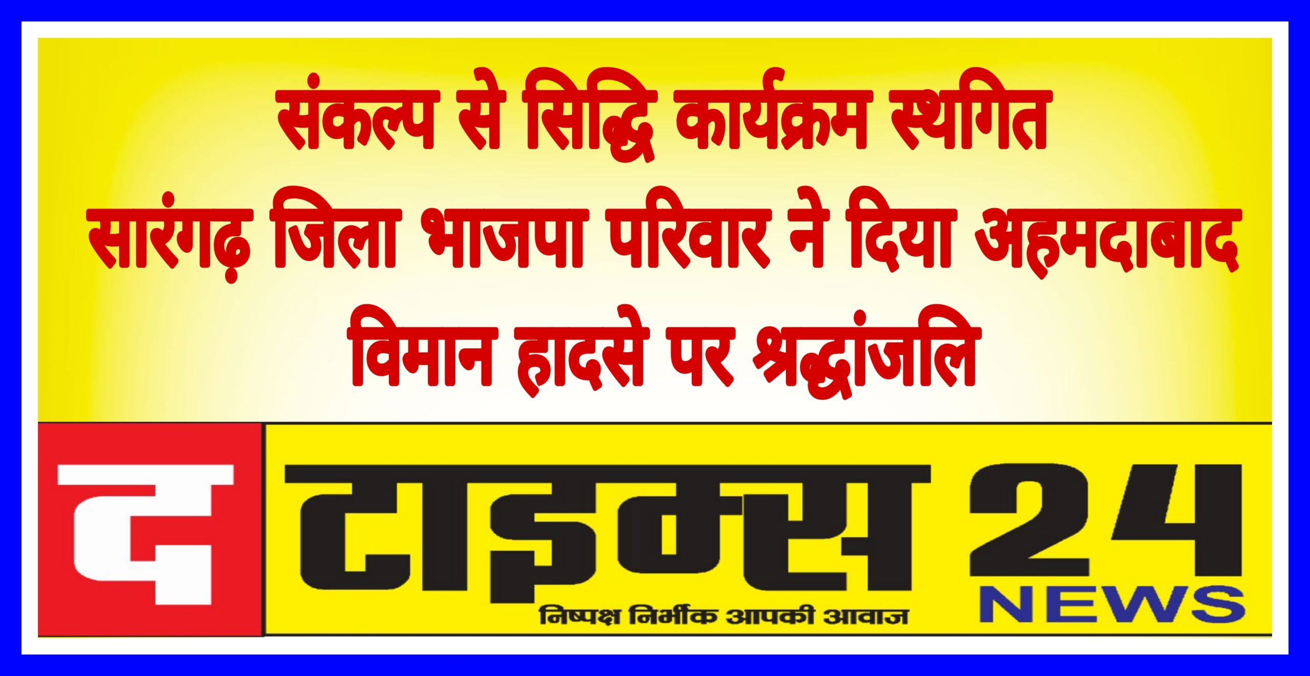।आज दिनाँक 12/6/25 को भारतीय जनता पार्टी द्वारा सारंगढ़ के केशरवानी भवन में “संकल्प से सिद्धि” कार्यक्रम के तहत आयोजित प्रोफेशनल मीट को अहमदाबाद के सरदार वल्लभभाई पटेल अंतरराष्ट्रीय हवाई अड्डे पर एयर इंडिया के विमान दुर्घटना की दुखद खबर के कारण बीच में ही स्थगित कर दिया गया। इस हादसे में 242 यात्री सवार थे।इस दुखद घटना के प्रति संवेदना व्यक्त करते हुए उपस्थित सभी लोगों ने दो मिनट का मौन धारण कर हादसे में जान गंवाने वालों को श्रद्धांजलि अर्पित की और घायलों के शीघ्र स्वस्थ होने की कामना की। कार्यक्रम, जो सेवा, सुशासन और गरीब कल्याण की थीम पर आधारित था, की प्रेस वार्ता के लिए उपस्थित छत्तीसगढ़ शासन के सरगुजा विकास प्राधिकरण की उपाध्यक्ष श्रीमती गोमती साय ने गहरा शोक व्यक्त करते हुए कहा, “यह एक राष्ट्रीय त्रासदी है। हमारी संवेदनाएं पीड़ित परिवारों के साथ हैं।”स्थानीय प्रशासन और आयोजन समिति ने इस हादसे के प्रति एकजुटता दिखाते हुए भविष्य में ऐसी घटनाओं की पुनरावृत्ति रोकने के लिए उचित कदम उठाने की मांग की।