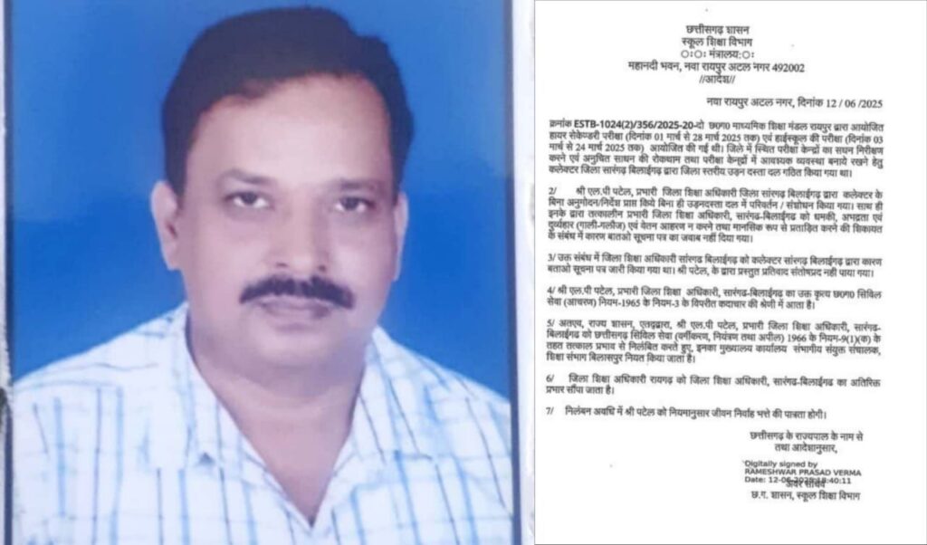सारंगढ़-बिलाईगढ़//छत्तीसगढ़ माध्यमिक शिक्षा मंडल रायपुर द्वारा आयोजित बोर्ड परीक्षाओं के दौरान केंद्रों के निरीक्षण और व्यवस्थाओं में लापरवाही बरतने के मामले में बड़ी कार्यवाही की गई है। स्कूल शिक्षा विभाग द्वारा जारी आदेश के अनुसार, जिला शिक्षा अधिकारी,सारंगढ़-बिलाईगढ़ एल.पी. पटेल को सेवा से हटा दिया गया है। मामला उस समय प्रकाश में आया जब बिना अनुमोदन और अनुमति के एल.पी. पटेल द्वारा परीक्षा केंद्रों का निरीक्षण किया गया और संबंधित कलेक्टर से पूर्व अनुमति लिए बिना ही केंद्रों की व्यवस्था में परिवर्तन कर दिया गया। इस कार्रवाई से संबंधित शिकायत प्राप्त होने पर जिला शिक्षा अधिकारी रायगढ़ को इस संबंध में जांच कर प्रतिवेदन प्रस्तुत करने को कहा गया था।