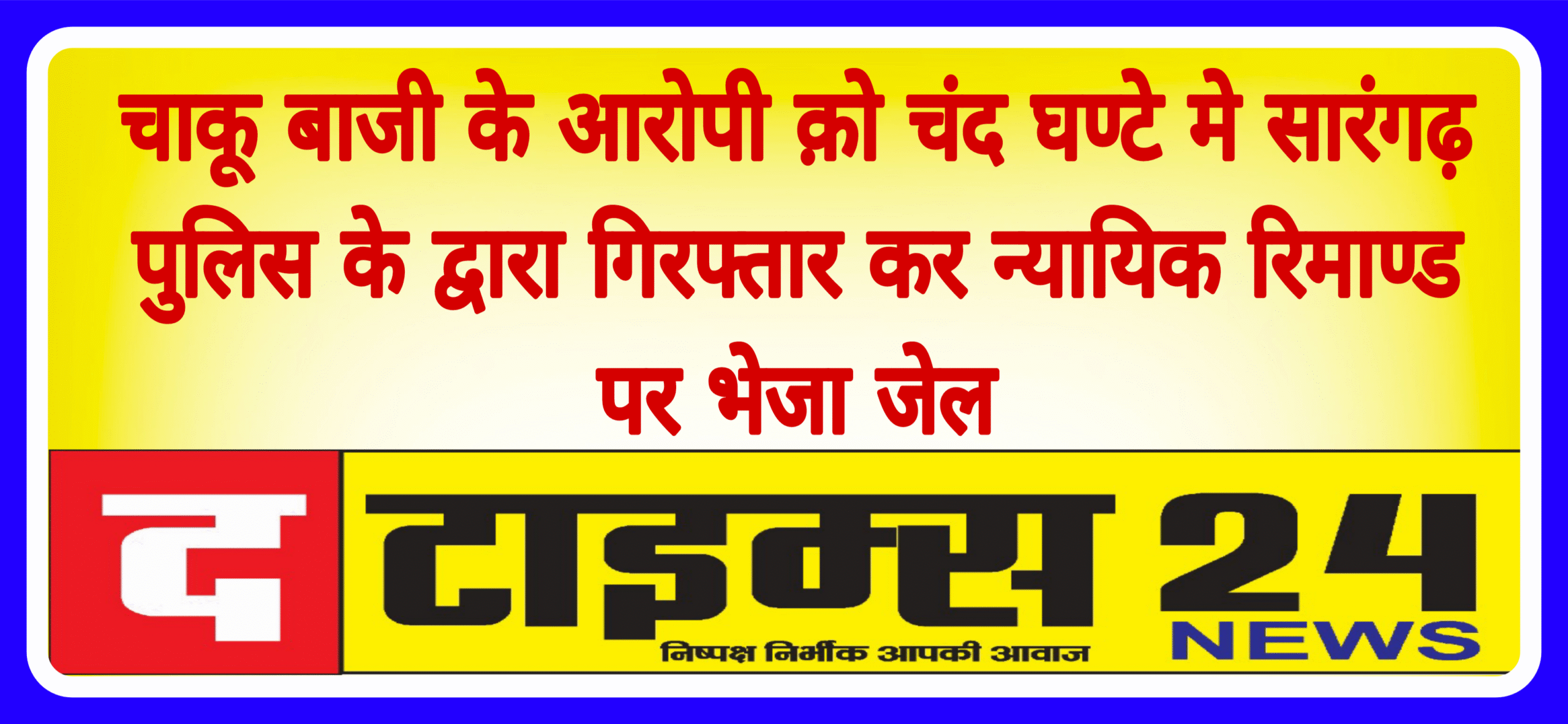 सारंगढ़ बिलाईगढ़ //श्रीमान पुलिस अधीक्षक महोदय श्री आंजनेय वार्ष्णेय, अति0 पुलिस अधीक्षक श्रीमती निमिषा पाण्डेय एवं एसडीओपी श्रीमति स्नेहिल साहू के द्वारा चाकू बाजी करने वालो के ऊपर त्वरित कार्यवाही हेतु निर्देशित किये जाने पर थाना प्रभारी कोतवाली निरीक्षक कामिल हक के कुशल मार्ग दर्शन में थाना सिटी कोतवाली सारंगढ़ क़ो चाकूबाजी के आरोपी तो त्वरित गिरफ्तार करने मे सफलता प्राप्त हुई । अप0 क्र0 294/2025 धारा- 109 (1) बी०एन०एस० मे दिनांक 21.06.2025 को प्रार्थी ललित बरेठ साकिन नवरंगपुर थाना कोतवाली सांरगढ़ थाना उपस्थित आकर रिपोर्ट दर्ज कराया कि इसके बड़े भाई लखन बरेठ गांव के संजू नंदे के पान ठेला के पास समान लेने गया था। उसी समय गांव के जितेन्द्र सिदार पीछे तरफ से लखन बरेठ को जान से मारने की नियत से गले पर धारदार चाकू से वार कर दिया जो गंभीर रुप से घायल होने पर ईलाज के लिए राधाकृष्ण अस्पताल सांरगढ़ मे गंभीर अवस्था में भर्ती किया गया ।रिपोर्ट पर अपराध पंजीबद्ध कर विवेचना में लिया गया।