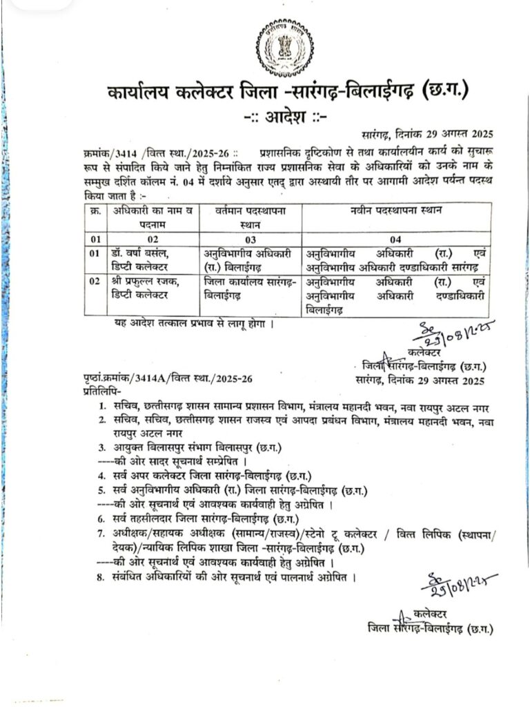 सारंगढ़ बिलाईगढ़, 29 अगस्त 2025/कलेक्टर डॉ संजय कन्नौजे ने जिले में प्रशासनिक कार्यों के मद्देनजर और कार्यालयीन कार्यों के सुचारू संचालन के लिए डिप्टी कलेक्टर वर्षा बंसल को एसडीएम सारंगढ़ और डिप्टी कलेक्टर प्रफुल्ल रजक को एसडीएम बिलाईगढ़ के पद पर नवीन पदस्थापना किया है। उल्लेखनीय है कि लगभग एक माह की अवधि में जिले में प्रशासनिक अधिकारी प्रखर चंद्राकर और अनिकेत साहू का स्थानांतरण अन्य जिले में हुआ है, जिसके कारण एसडीएम का नवीन पदस्थापना आदेश जारी किया गया।