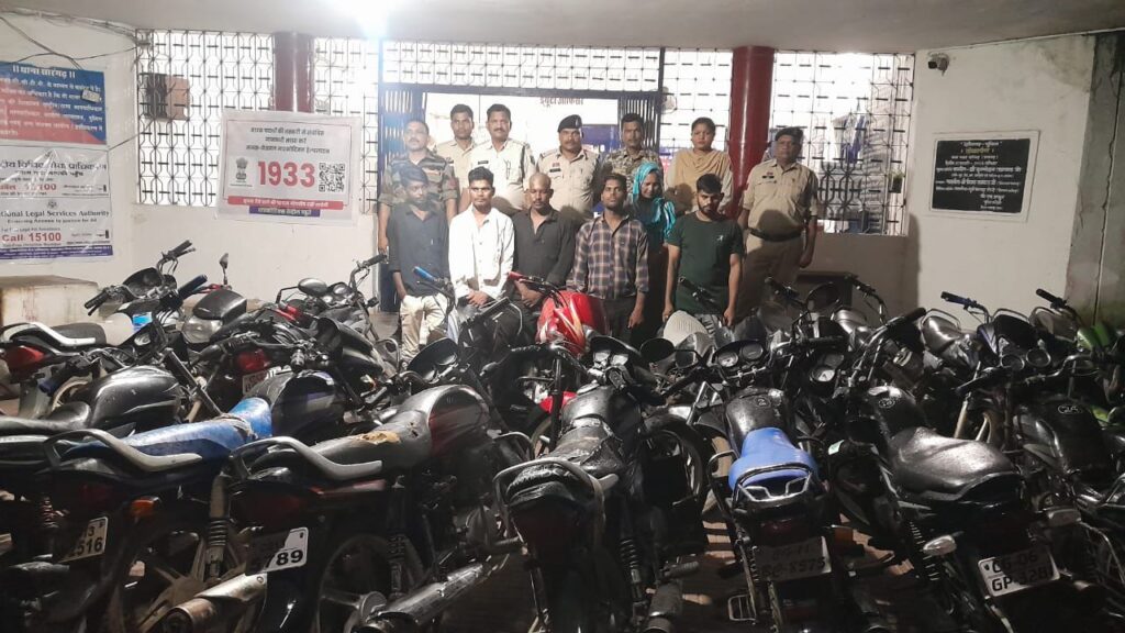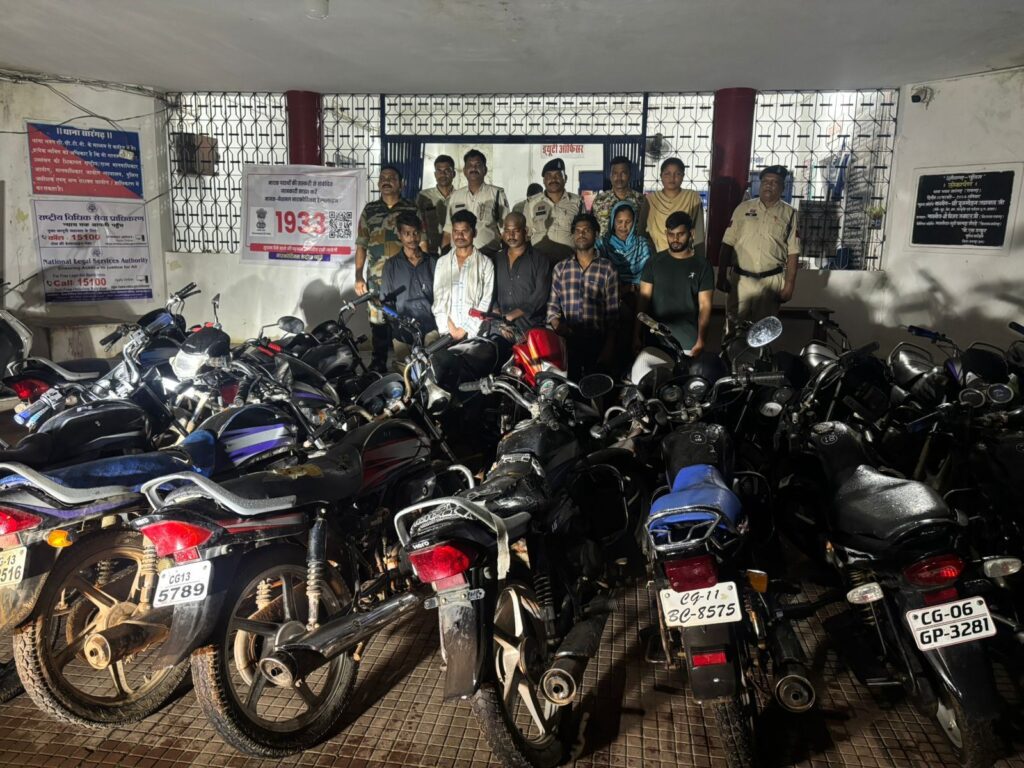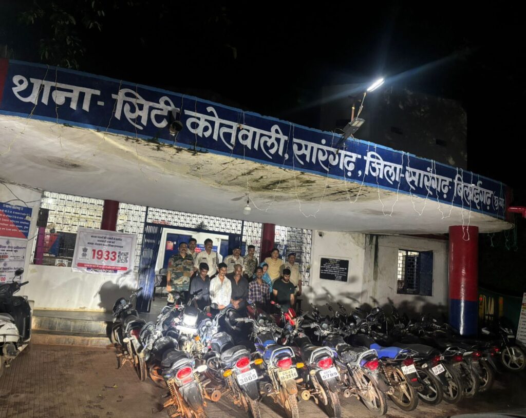 थाना सिटी कोतवाली सारंगढ़ के अपराध क्रमांक 450/2025 धारा 303(2),317(2),3(5) बीएनएस मे प्रार्थी संजय सारथी पिता ज्योति राम निवासी रेंजर पर सारंगढ़ के द्वारा थाना आकर लिखित आवेदन पत्र पेश कर रिपोर्ट दर्ज कराया की प्रार्थी दिनांक 30.8.2025 को शाम के 4:00 बजे अपने मोटरसाइकिल क्रमांक सीजी 13 बी 6955 से सब्जी खरीदने सारंगढ़ सब्जी बाजार गया था सब्जी खरीद कर शाम करीबन 4.30 बजे वापस आकर देखा तो वहां पर उसकी मोटरसाइकिल नहीं था कोई अज्ञात चोर मोटरसाइकिल को चोरी कर ले गया था की रिपोर्ट अपराध पंजीबद्ध कर विवेचना में लिया गया विवेचना दौरान जरिए मुखबिर सूचना पर आरोपी अंकित देवांगन पिता अनंत राम देवांगन निवासी रायगढ़, विश्वकर्मा यादव पिता राजकुमार यादव निवासी डभरा, बृजेश चौहान उर्फ विशाल उर्फ विजय पिता काशीराम चौहान निवासी सारंगढ़ व अन्य दो फरार आरोपियों के द्वारा सारंगढ़ जिला के आसपास के जिलों से करीबन 30 बाइक चोरी करना पता चला तथा जिसमे से कुछ मोटरसाइकिल को सीता -सिदार पति धर्मजीत सिदार निवासी सारंगढ़ के माध्यम से सारंगढ़ क्षेत्र में बिक्री करना बताएं तथा चोरी की मोटरसाइकिल जानते हुए गोपी सिदार पिता गणेश सिदार निवासी सारंगढ़ तथा दीपक यादव पिता जनक राम यादव निवासी सारंगढ़ के द्वारा खरीदने पर सभी आरोपियों से कुल 30 मोटरसाइकिल जुमला रकम करीबन 18 लाख रुपए को मुताबिक जप्ती पत्रक के जप्त किया गया बाद सभी आरोपियों कों गिरफ्तार कर न्यायिक रिमांड पर जेल भेजा गया।