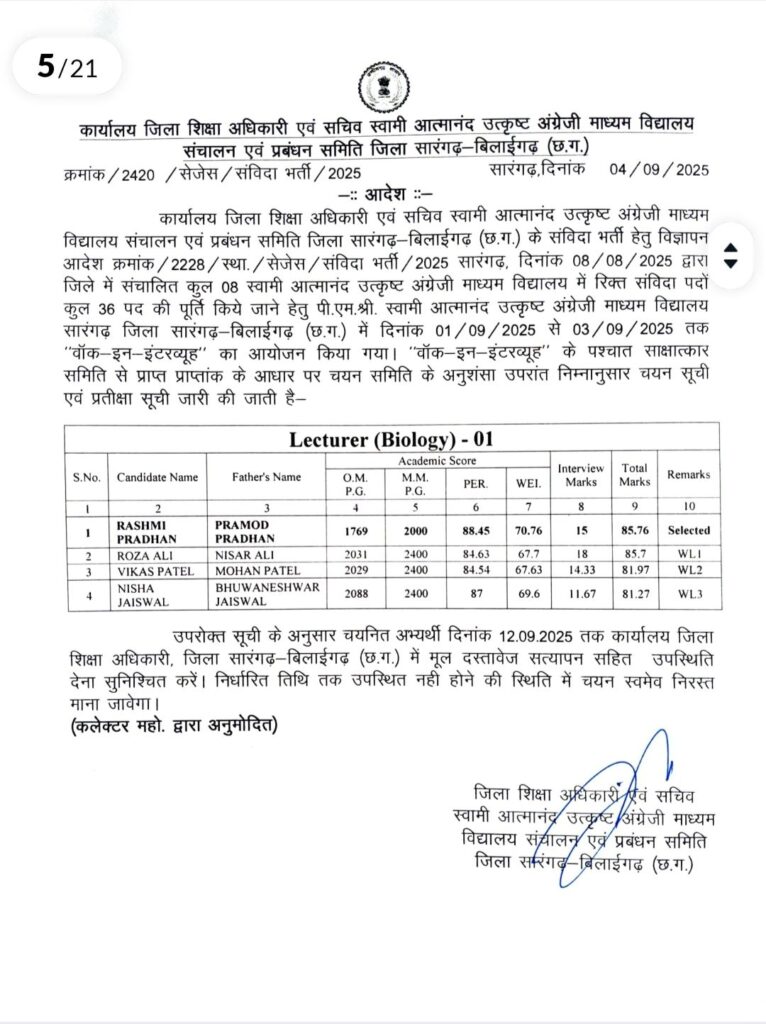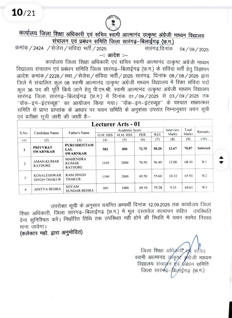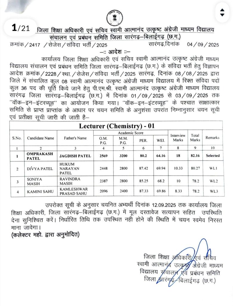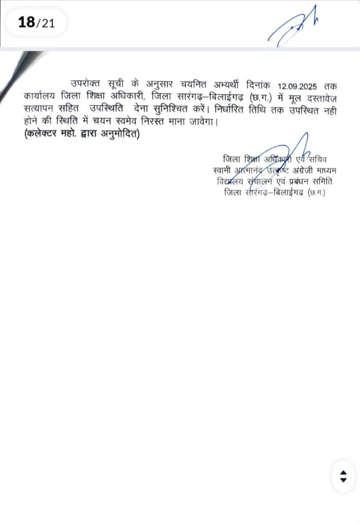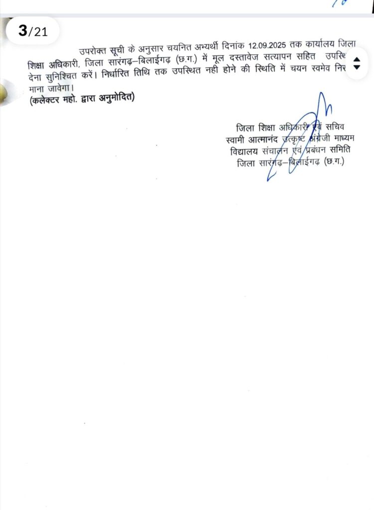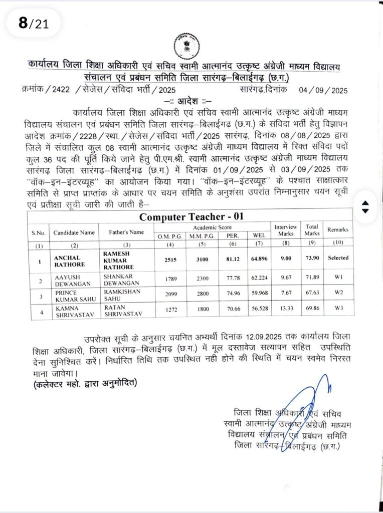 सारंगढ़ बिलाईगढ़// कलेक्टर डॉ संजय कन्नौजे के नेतृत्व और मार्गदर्शन में जिले के स्वामी आत्मानंद विद्यालयों के लिए व्याख्याता और अन्य शिक्षकों का संविदा भर्ती का नियुक्ति पत्र शीघ्र जारी किया है, जो वेबसाइट सारंगढ़ बिलाईगढ़ डॉट सीजी डॉट जीओवी डॉट इन https://sarangarh-bilaigarh.cg.gov.in/ पर उपलब्ध है। कलेक्टर डॉ कन्नौजे की ओर से यह शिक्षक दिवस के अवसर पर जिले के बच्चों के लिए शिक्षक नियुक्ति का उपहार है।