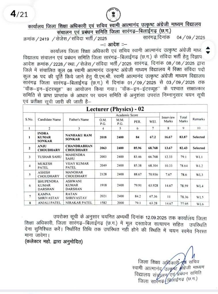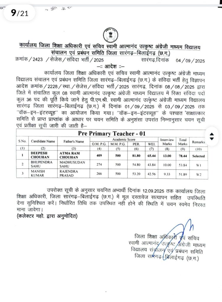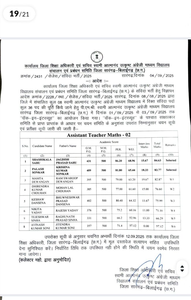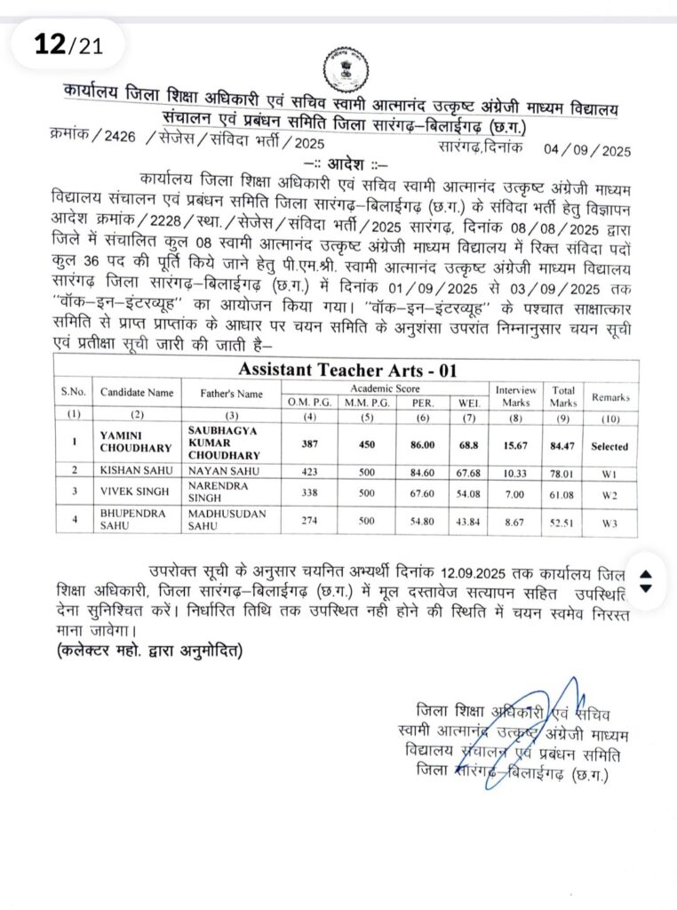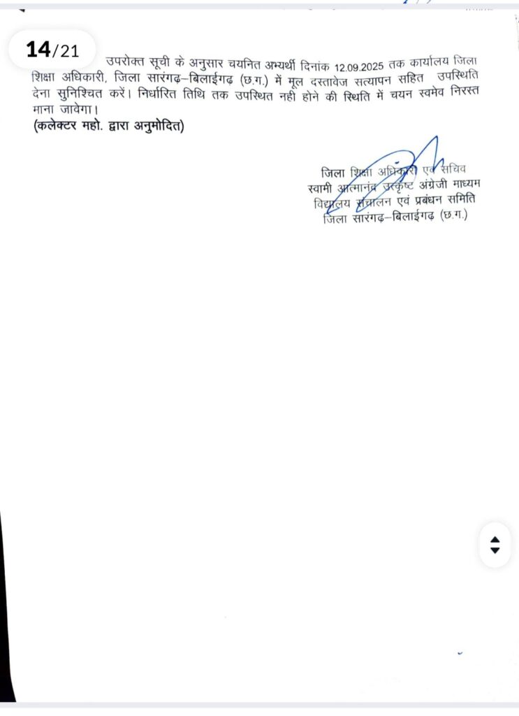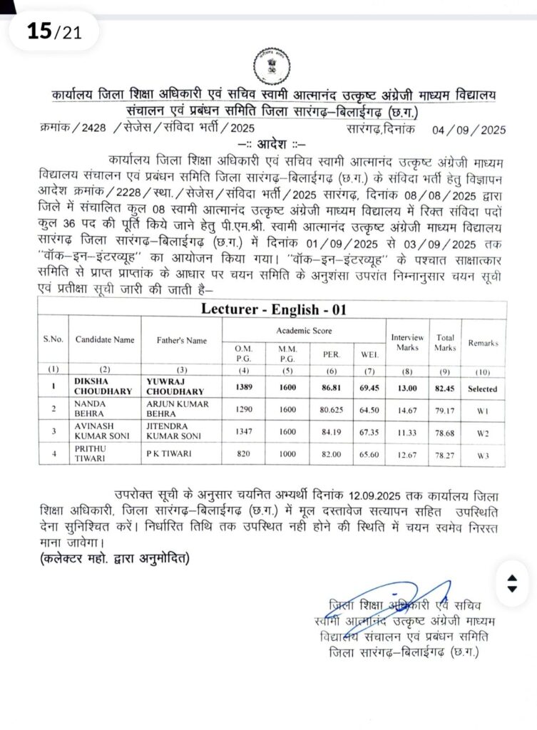 सारंगढ़ बिलाईगढ़// कलेक्टर डॉ संजय कन्नौजे के नेतृत्व और मार्गदर्शन में जिले के स्वामी आत्मानंद विद्यालयों के लिए व्याख्याता और अन्य शिक्षकों का संविदा भर्ती का नियुक्ति पत्र शीघ्र जारी किया है, जो वेबसाइट सारंगढ़ बिलाईगढ़ डॉट सीजी डॉट जीओवी डॉट इन https://sarangarh-bilaigarh.cg.gov.in/ पर उपलब्ध है। कलेक्टर डॉ कन्नौजे की ओर से यह शिक्षक दिवस के अवसर पर जिले के बच्चों के लिए शिक्षक नियुक्ति का उपहार है।