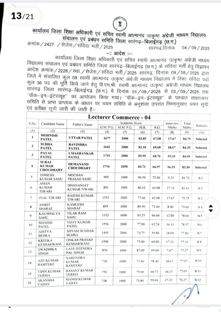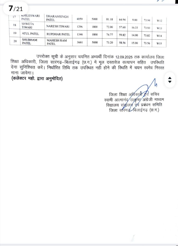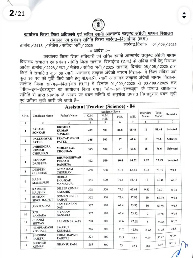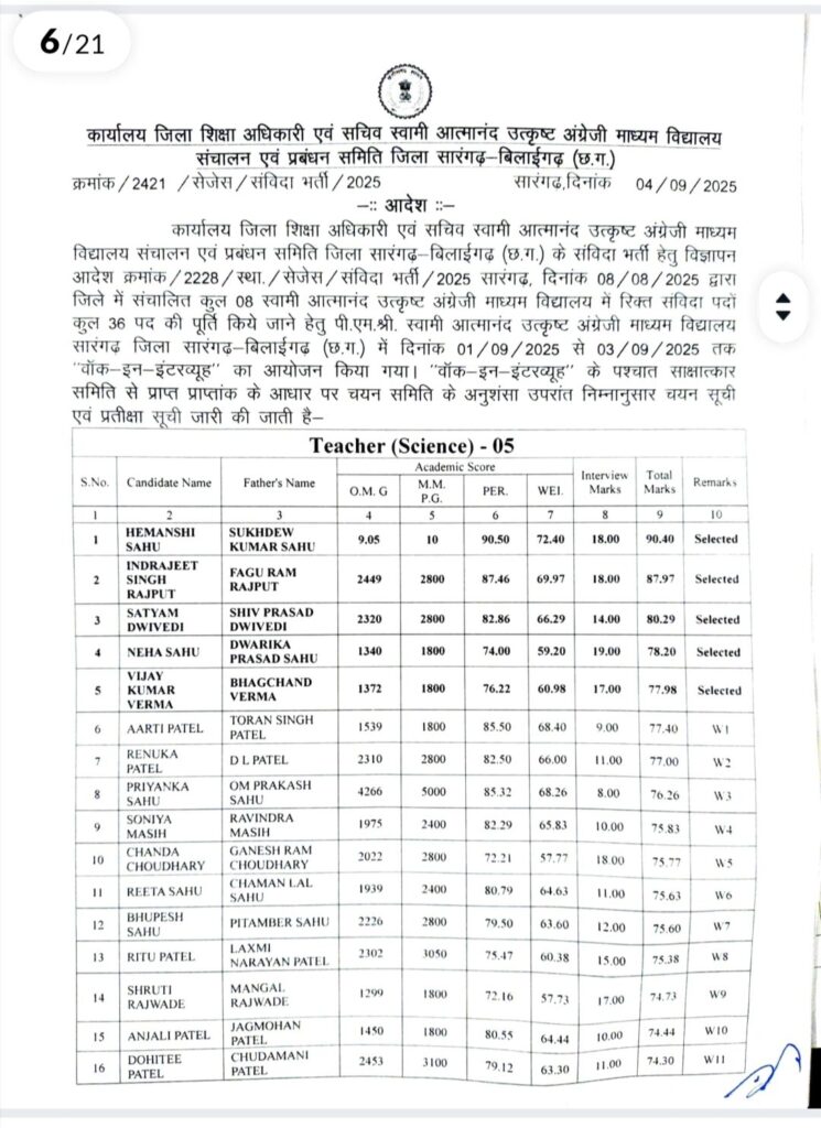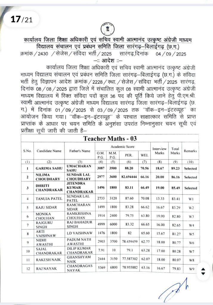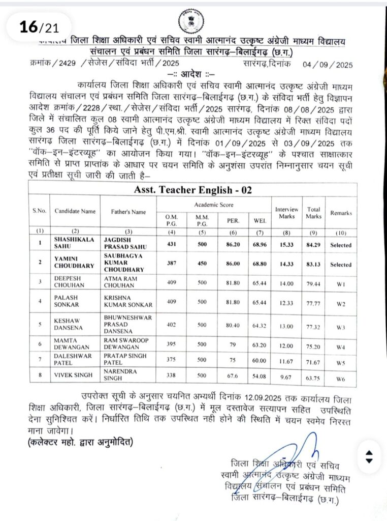 सारंगढ़ बिलाईगढ़// कलेक्टर डॉ संजय कन्नौजे के नेतृत्व और मार्गदर्शन में जिले के स्वामी आत्मानंद विद्यालयों के लिए व्याख्याता और अन्य शिक्षकों का संविदा भर्ती का नियुक्ति पत्र शीघ्र जारी किया है, जो वेबसाइट सारंगढ़ बिलाईगढ़ डॉट सीजी डॉट जीओवी डॉट इन https://sarangarh-bilaigarh.cg.gov.in/ पर उपलब्ध है। कलेक्टर डॉ कन्नौजे की ओर से यह शिक्षक दिवस के अवसर पर जिले के बच्चों के लिए शिक्षक नियुक्ति का उपहार है।