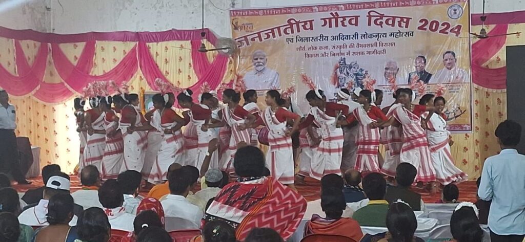 सारंगढ़ बिलाईगढ़ ///राज्य सरकार के पूर्व मंत्री और वर्तमान मुंगेली विधायक पुन्नूलाल मोहले के मुख्य आतिथ्य में जिला स्तरीय जनजातीय गौरव दिवस का शानदार आयोजन शासकीय कन्या उच्चतर माध्यमिक विद्यालय सारंगढ़ में किया गया। इस कार्यक्रम की शुरुआत में भगवान बिरसा मुंडा के तस्वीर के समक्ष दीप प्रज्ज्वलित कर पूजा अर्चना किया गया। लाइव कार्यक्रम से पीएम मोदी के भाषण को सभा में शामिल सभी नागरिकों ने सुना। सांस्कृतिक कार्यक्रम की प्रस्तुति में जय बूढ़ादेव कर्मा पार्टी भंडोरा, सारंगढ़ में जशपुर जिले के आदिवासी समाज के सरकारी कर्मी के समूह द्वारा शानदार नृत्य, बरमकेला, लेंधरा, साल्हेओना, बिलाईगढ़, सारंगढ़ भटगांव के प्री एवं पोस्ट मैट्रिक छात्रावास के बालक एवं बालिका के समूह और स्वामी आत्मानंद स्कूल बरमकेला तथा शासकीय कन्या उच्चतर माध्यमिक विद्यालय सारंगढ़ के स्कूली बालिकाओं और नृत्य की शानदार प्रस्तुति दी।